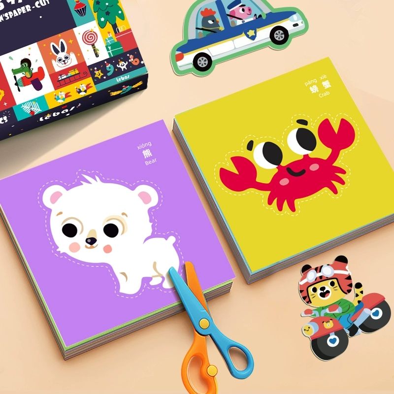 قص الورق الإبداعي - 90 ورقة طباعة ملونة (حيوانات) 1 صندوق + 1 مقص بلاستيكي