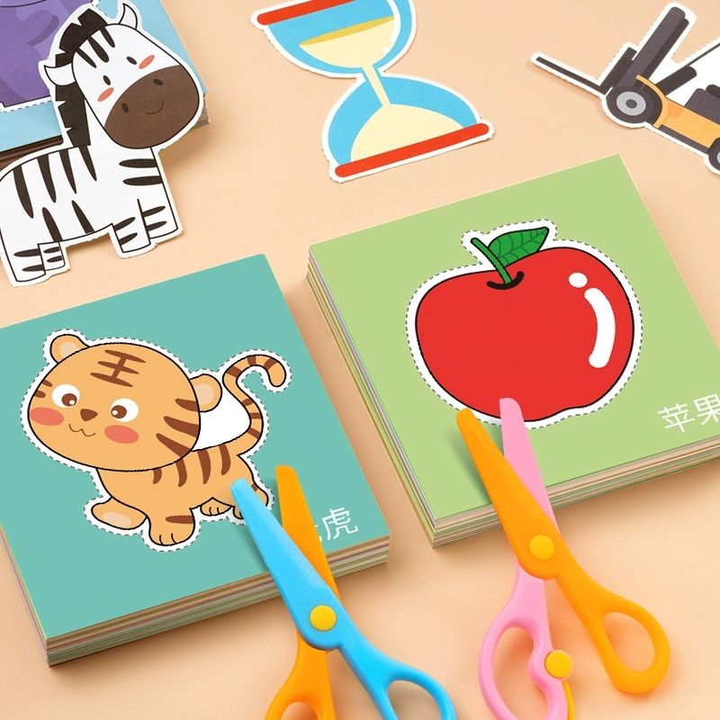 قص الورق الإبداعي - 270 ورقة طباعة ملونة (فاكهة + حيوانات + مباني مرور) 3 صناديق + 3 مقصات
