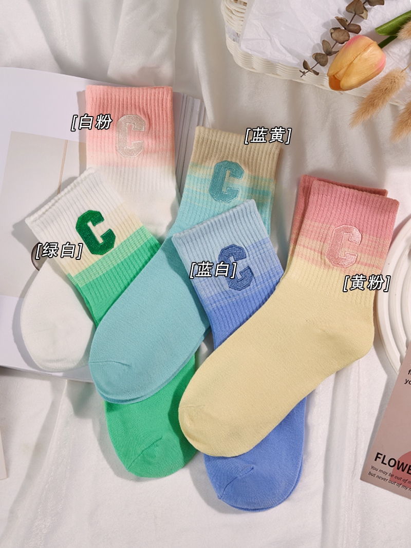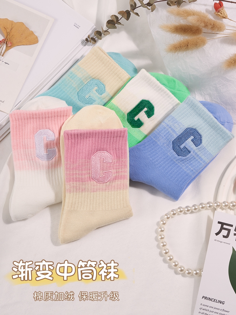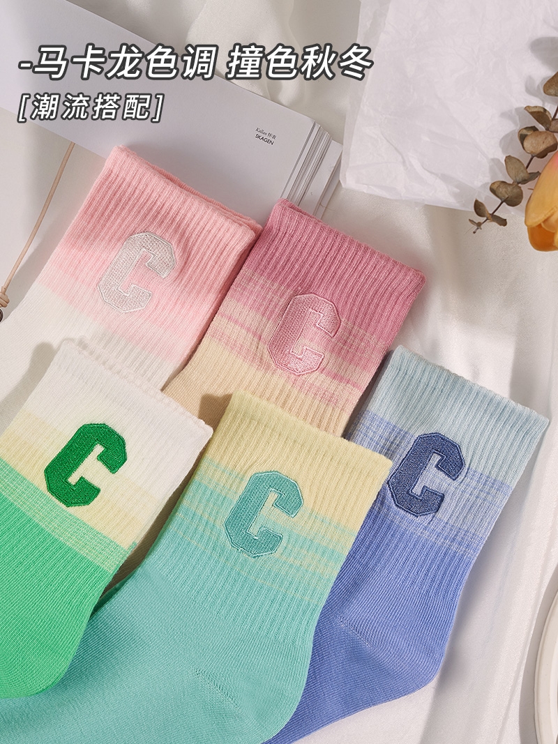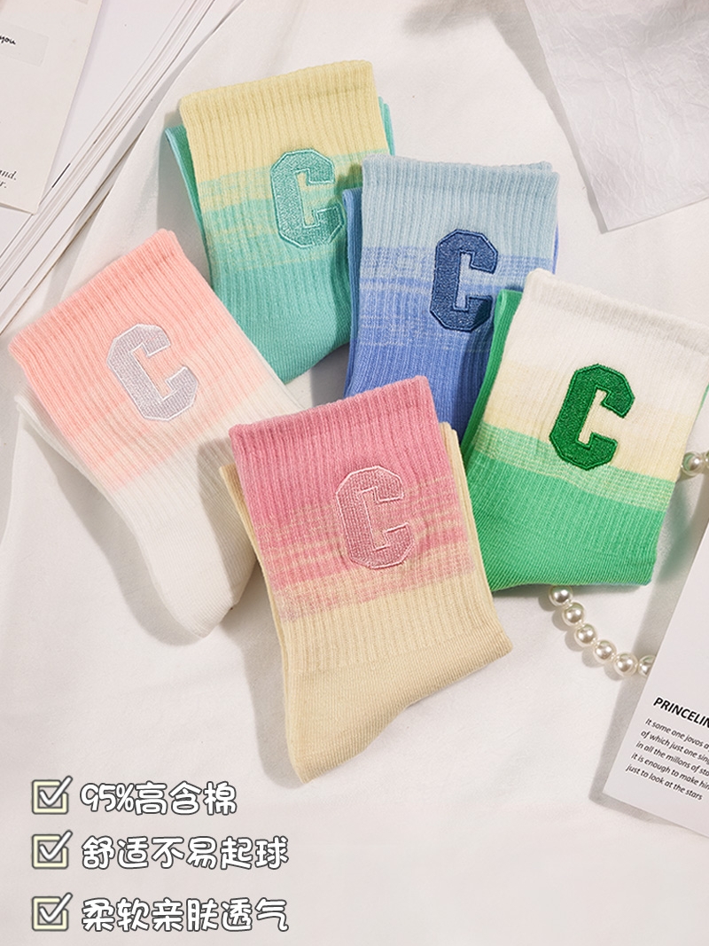 كمية Gradient Color Socks Women's Mid-Calf Socks Spring and Autumn Style Ins Cotton Trendy Korean Version C Letter Autumn and Winter Couple Sports Long Socks