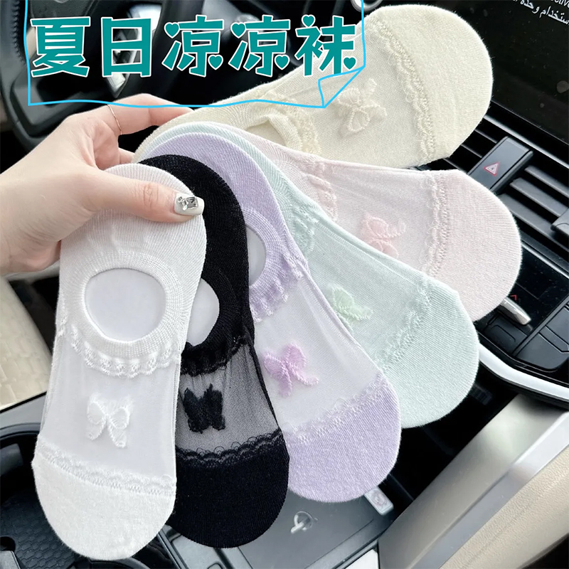 كمية Ice Silk Socks for Women Summer Shallow Mouth Thin Invisible Non-Slip Cotton Bottom Breathable Sweet Glass Silk Boat Socks