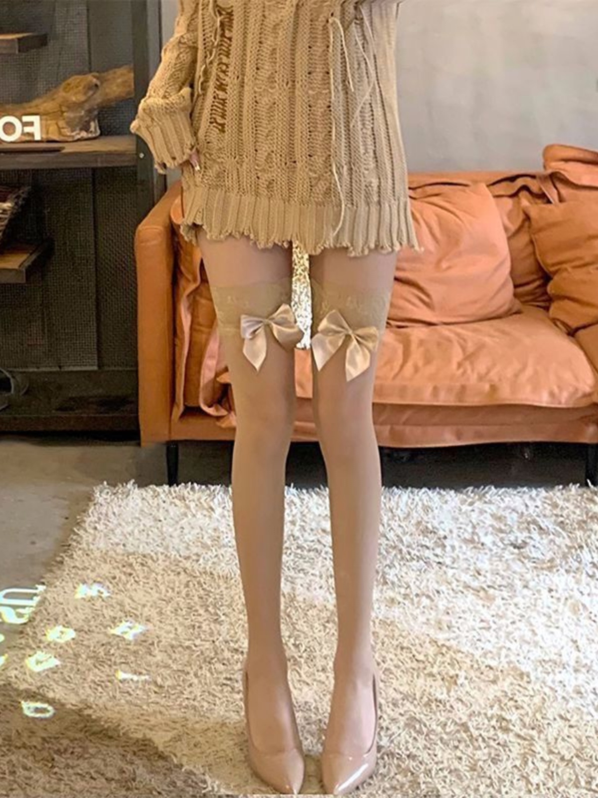 كمية Lace Trim Pink Stockings, Sexy Sheer Skin-tone Stockings with Bow, Spring and Summer Versatile Over-the-knee Socks