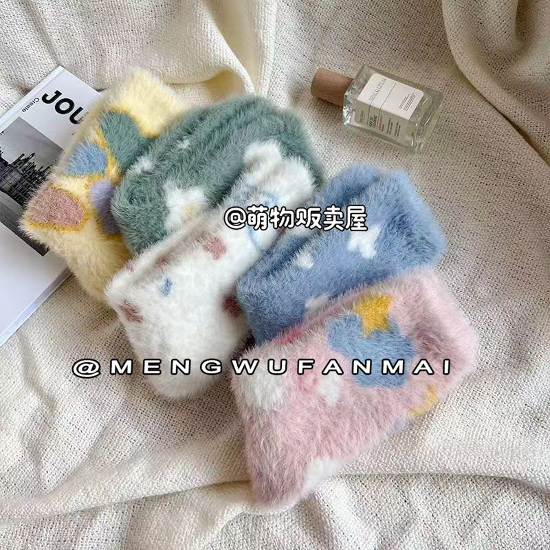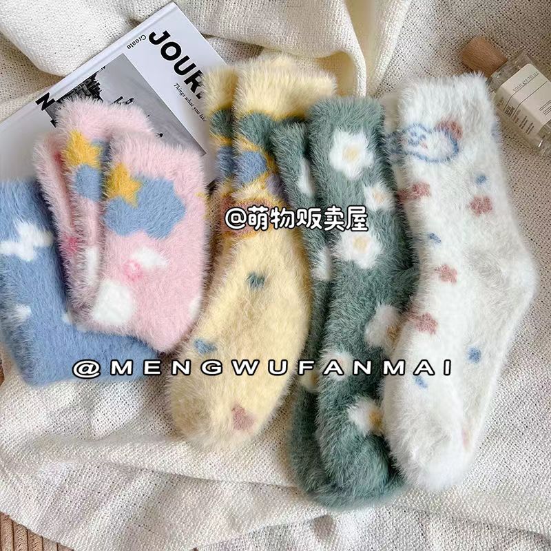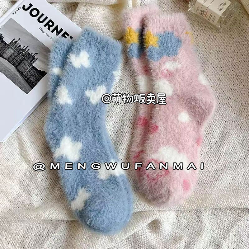 كمية New 'Butterfly White Cloud' Plush Cartoon Mink Warm Soft Warm Socks Breathable Mid-tube Socks