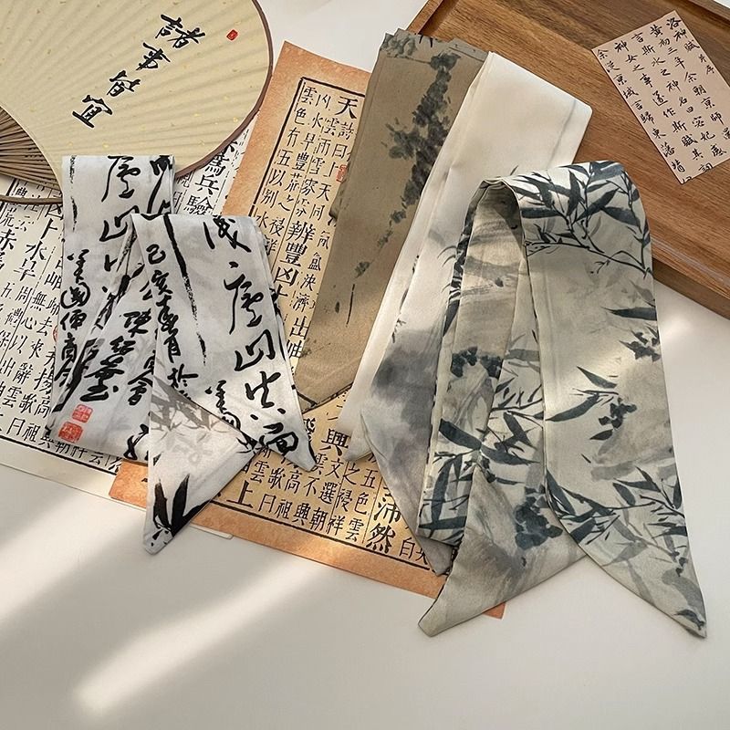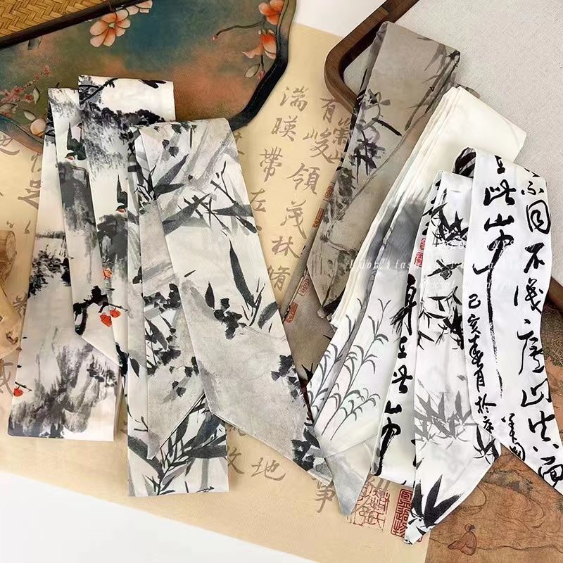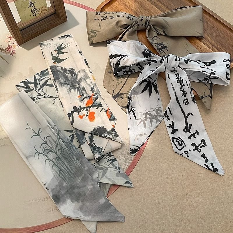 كمية New Style Ink Bamboo White Crane New Chinese Style Ancient Wind Headband Chinese Style Ink Painting Flowing Ribbon Elegant Bag Long Silk Scarf