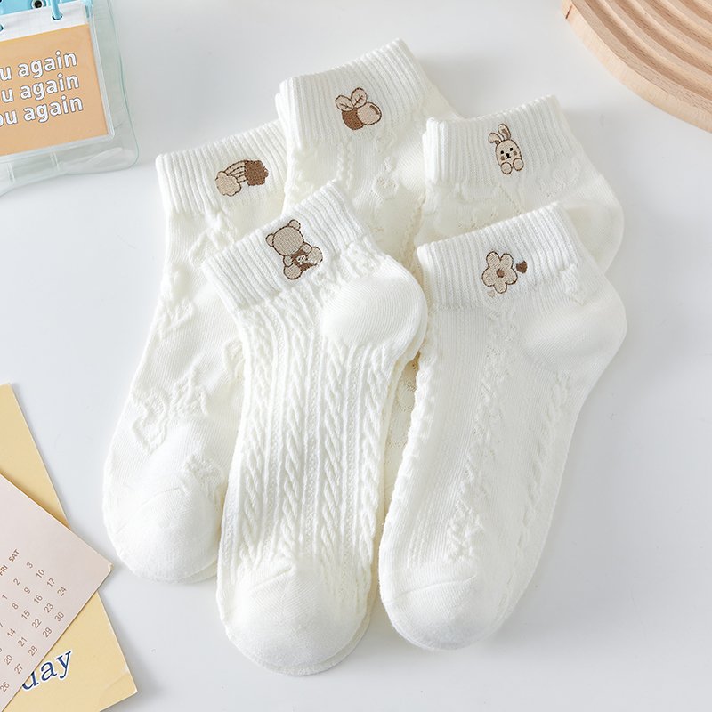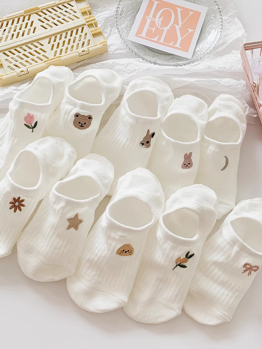 White Socks for Women, Summer Thin Boat Socks, Pure Cotton Embroidered Cute Japanese-style Invisible Socks, Non-slip Low-cut Socks