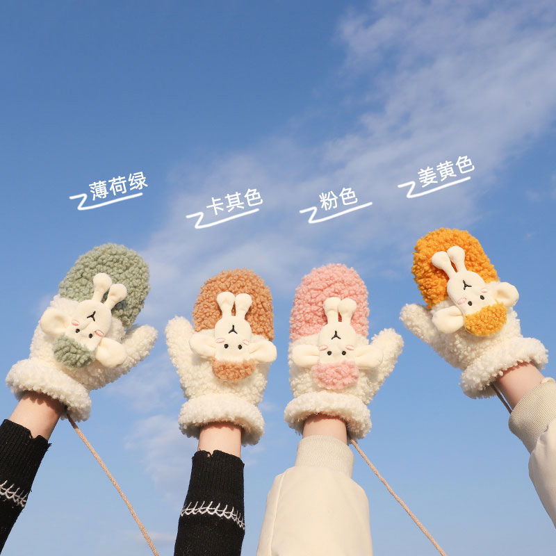Winter Lamb Fleece Bear Gloves for Women, Neck Hanging, Cute for Students, Thick and Warm