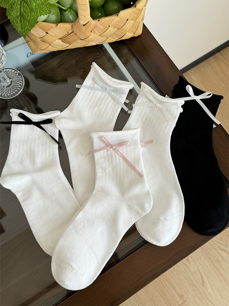 Ballet Style Bow Socks for Women, Summer Thin Cuff Mid-calf Socks, Simple Solid Color for Short Shoes