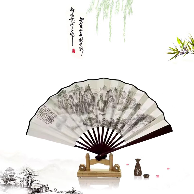 Silk Fabric Ancient Style Folding Fan, 10-inch Gift for Men and Women, Chinese Landscape Design
