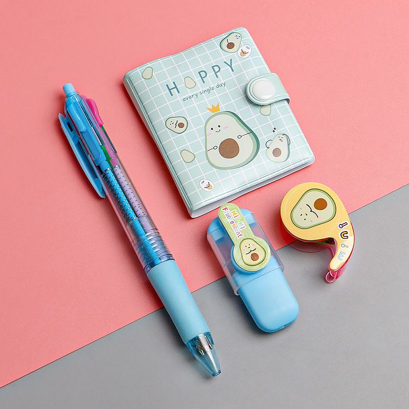 Back to School Cartoon Stationery Set Avocado Four-Color Push Pen Hand Account Book for Primary and Secondary School Students Prize
