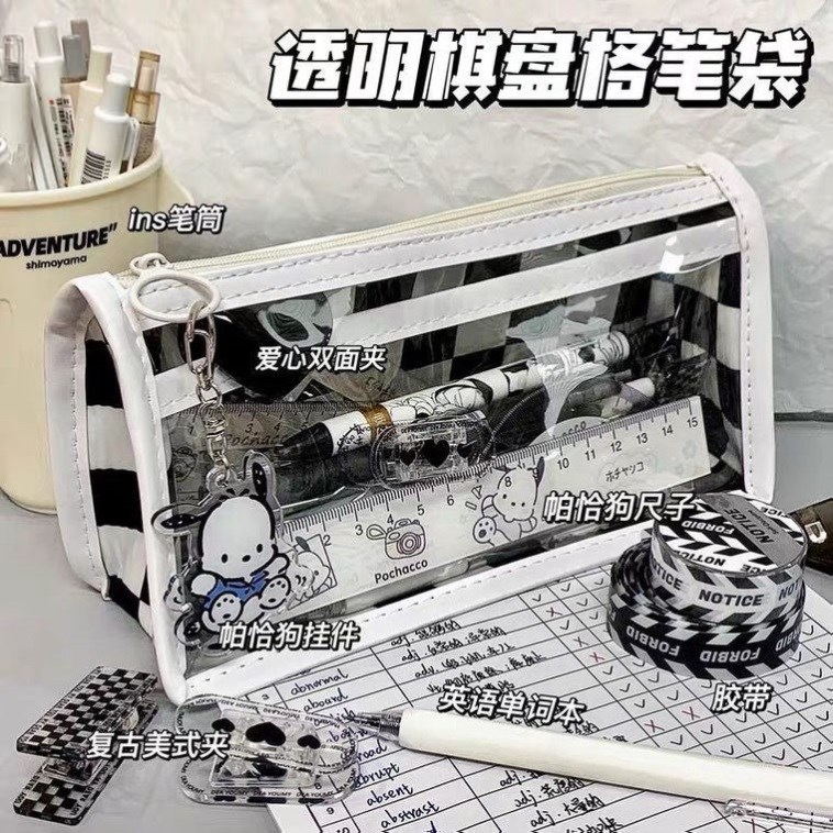 Checkered Transparent Pencil Case Simple Large Capacity Stationery Pencil Box High-Value Girl Japanese Style Student Junior High