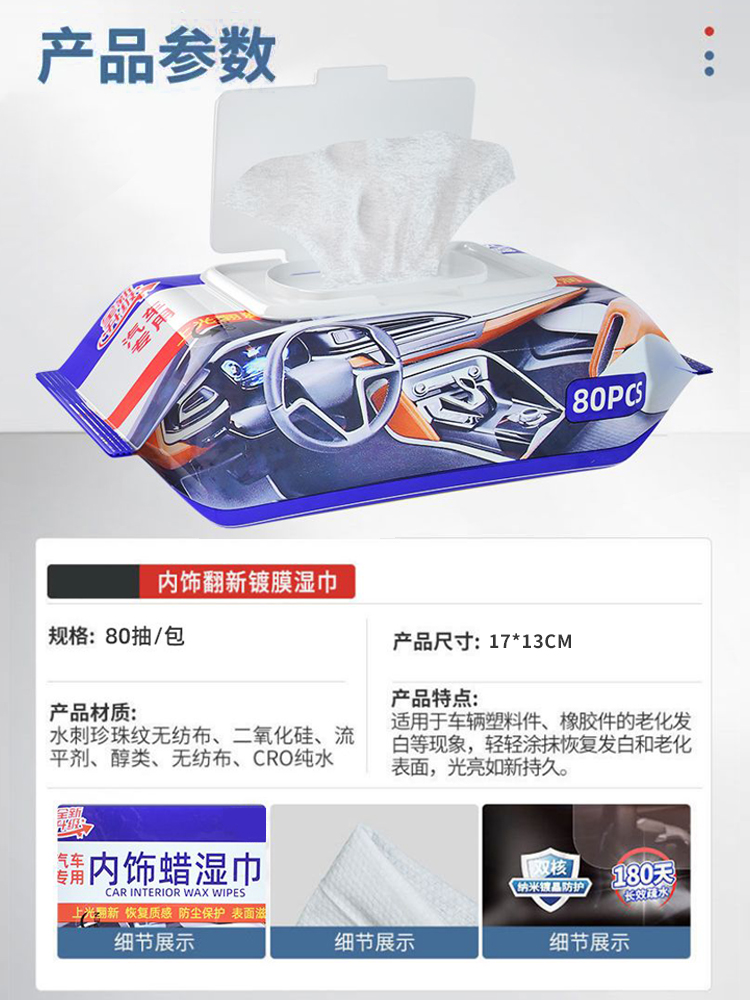 80 Sheets Car Interior Wax Cleaning Wet Wipes Cloth Special Car Interior Cleaning Artifact Renovation Stain Removal Dashboard Wax Leather quantity