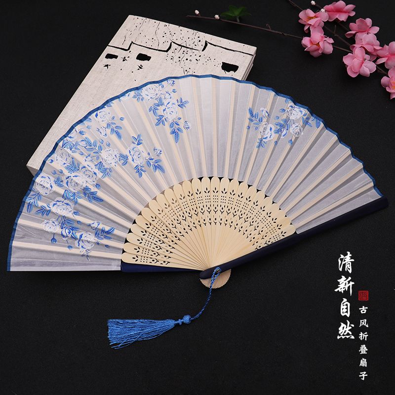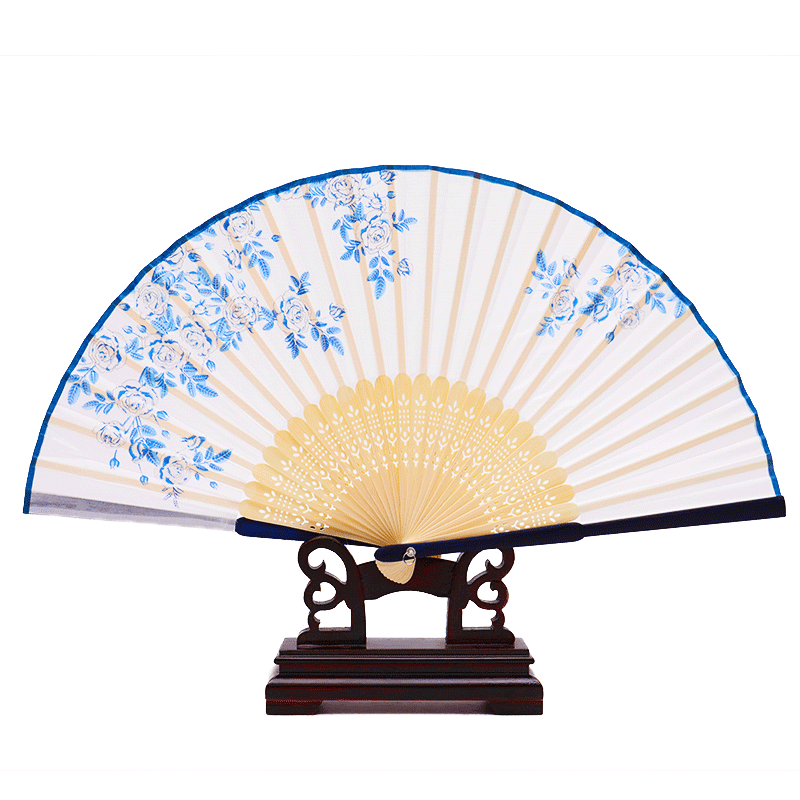 Without Fan Sleeve Ancient Style Folding Fan - Spring Warm Flowers + Blue Porcelain - 1 piece each