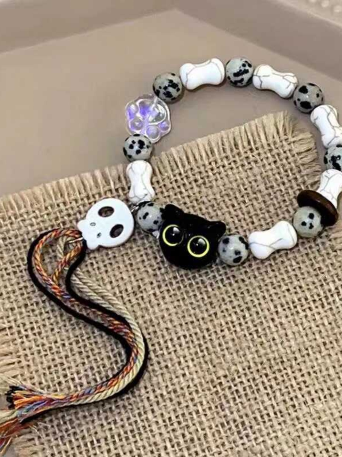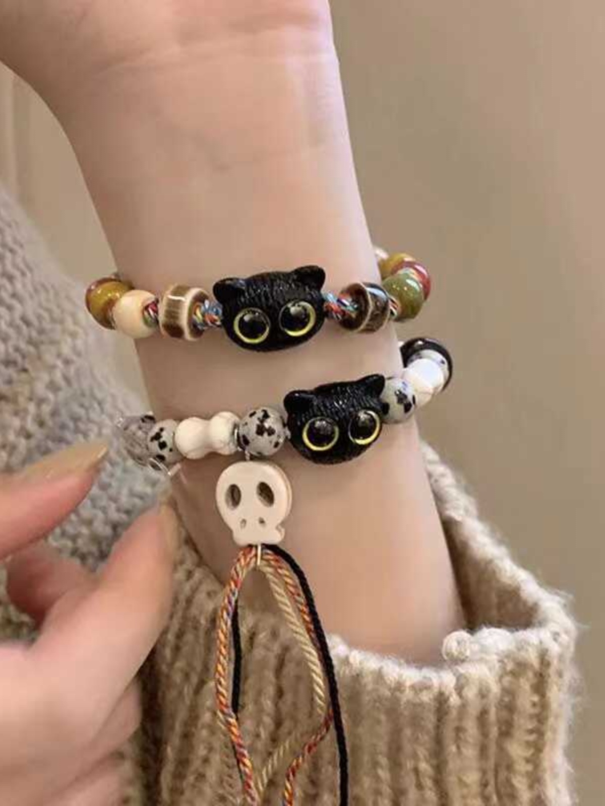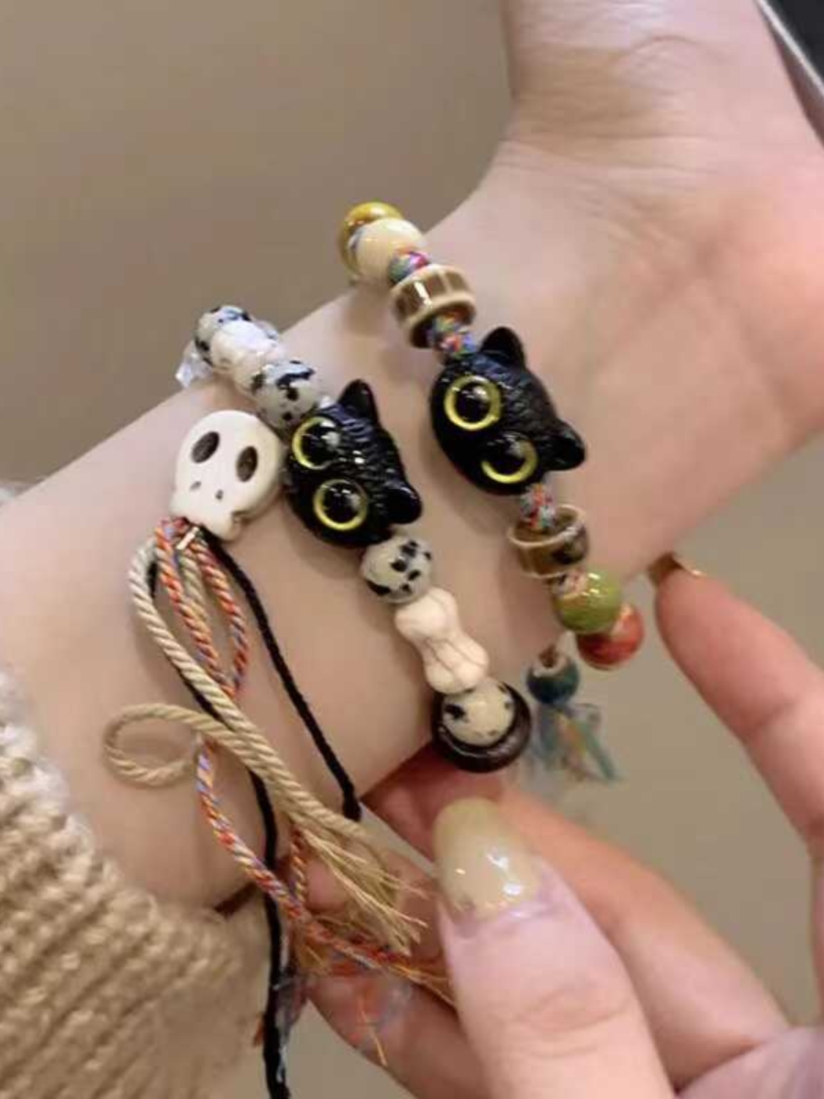 Skull Cat Ceramic Woven Rope Bracelet, Unique Design, Colorful Hand Accessories