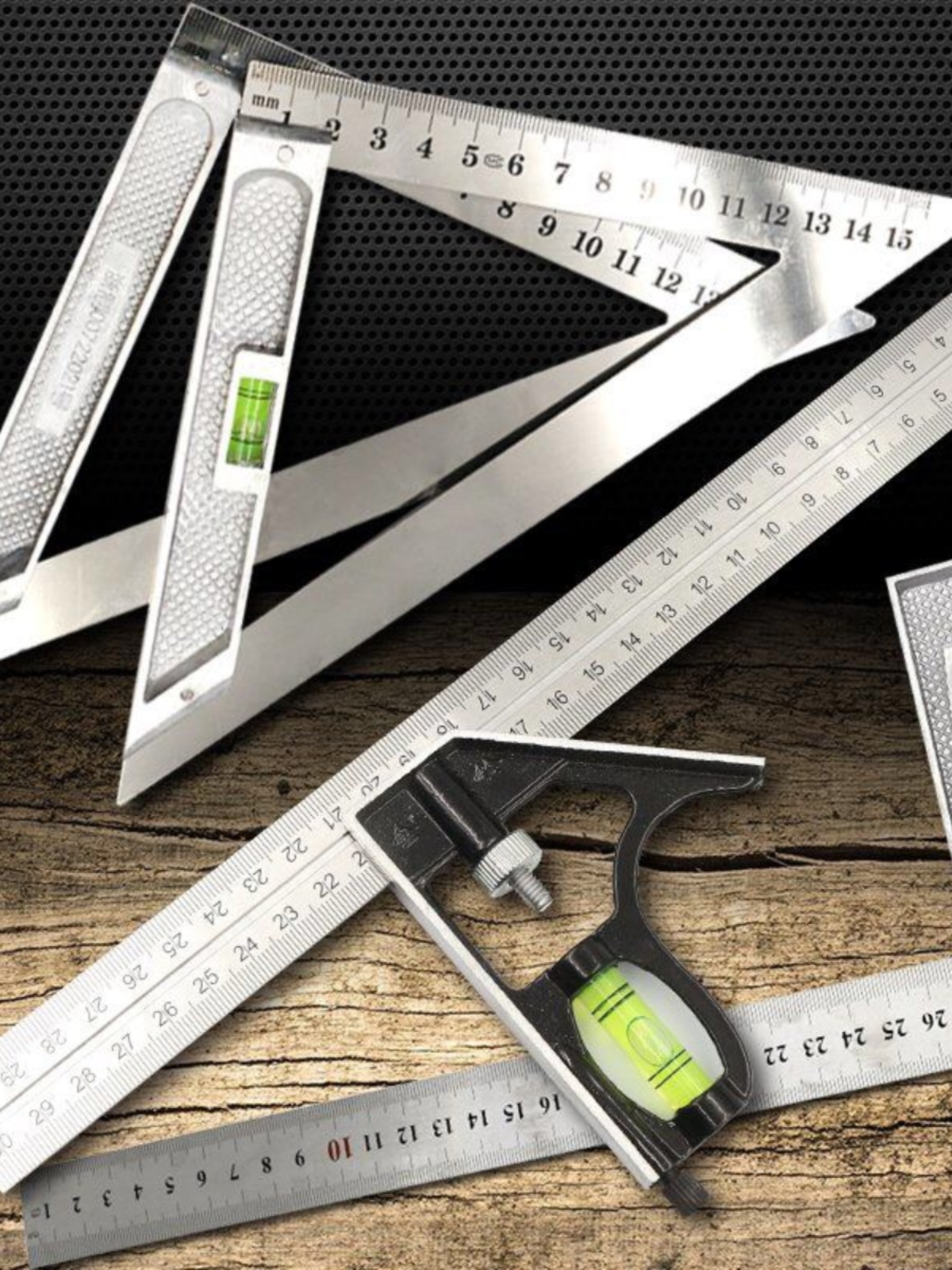 Régua de aço com nível, esquadros e escalas para marcenaria