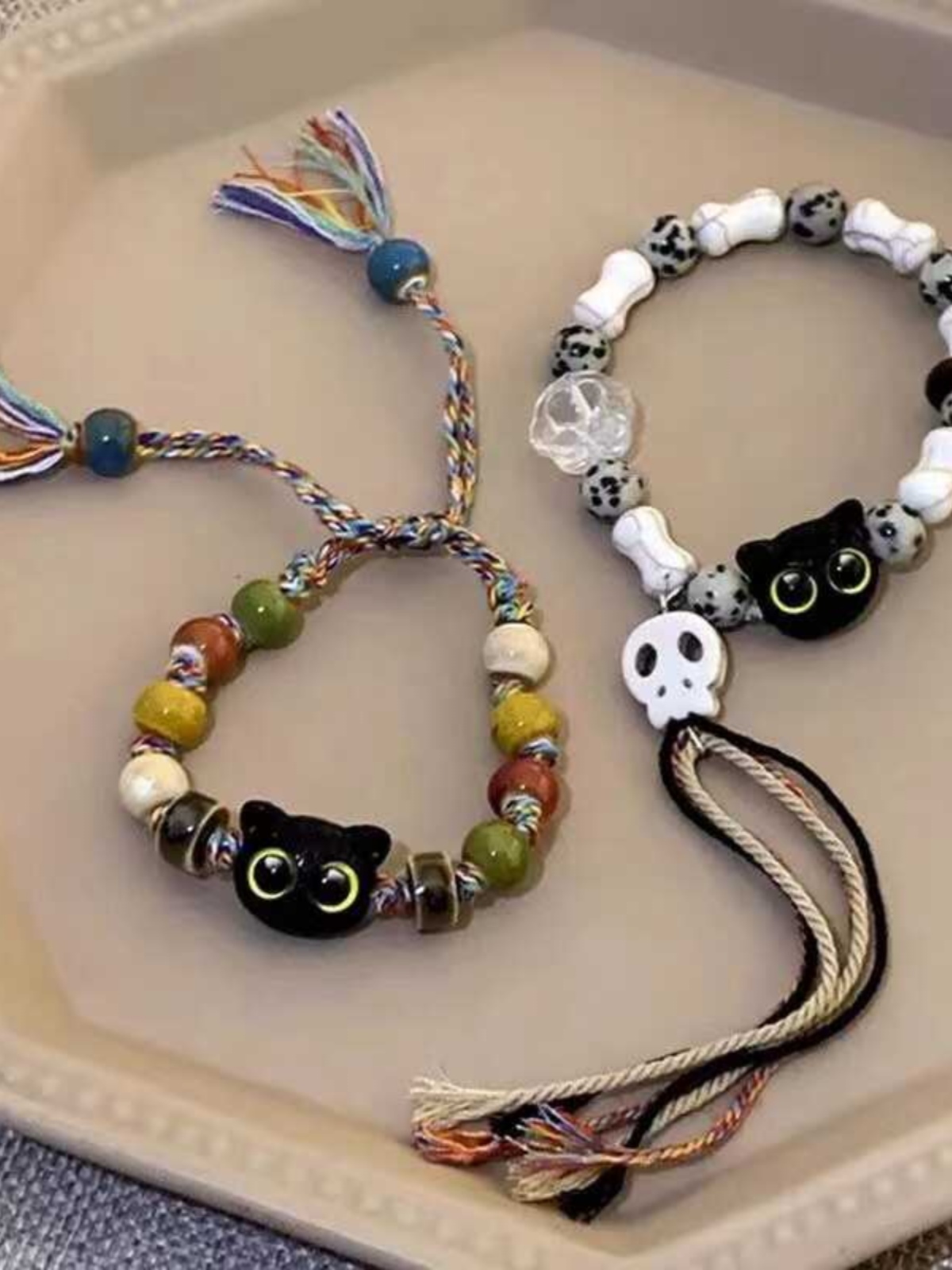 Браслет с черепом и кошкой, дизайнерский, с кисточками